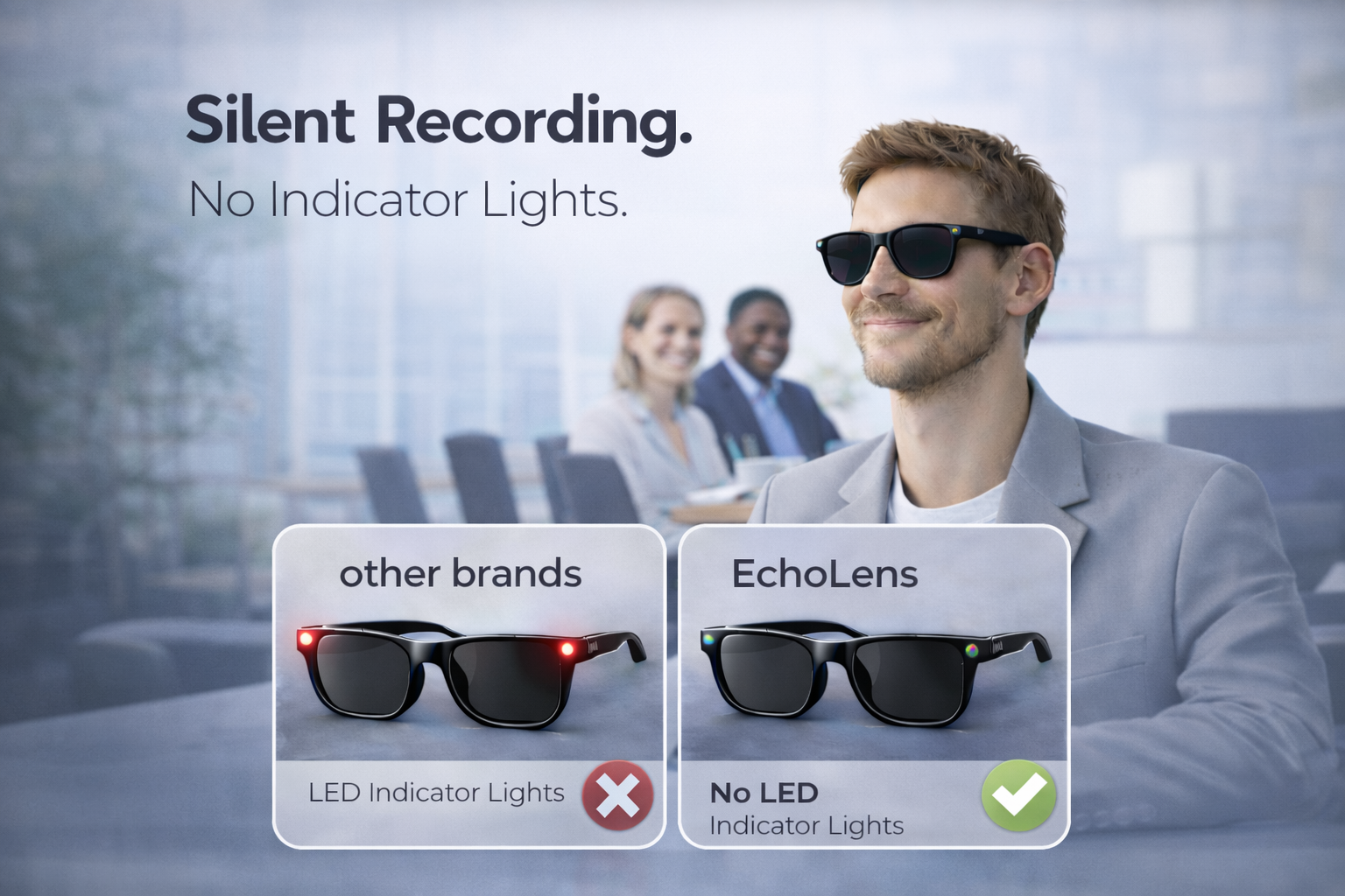 EchoLens records discreetly with no visible LED light. Nothing flashes, nothing gives you away — just natural, uninterrupted capture that looks and feels like everyday eyewear.